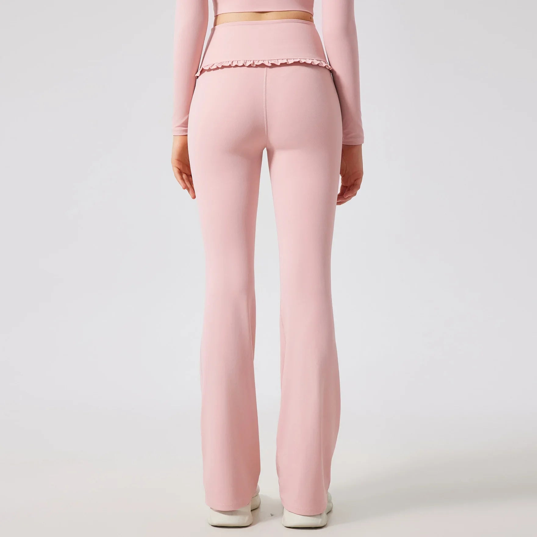 The Petal Flare Leggings combine comfort with a touch of playful elegance. Designed with a supportive high-rise waistband that smooths and flatters, they flow into a gentle flare leg for a lengthening silhouette. A soft, ruffled frill encircles the hips, adding feminine movement and a fashion-forward twist. Perfect for pairing with crop tops, tunics, or athleisure layers, they transition effortlessly from studio to street.